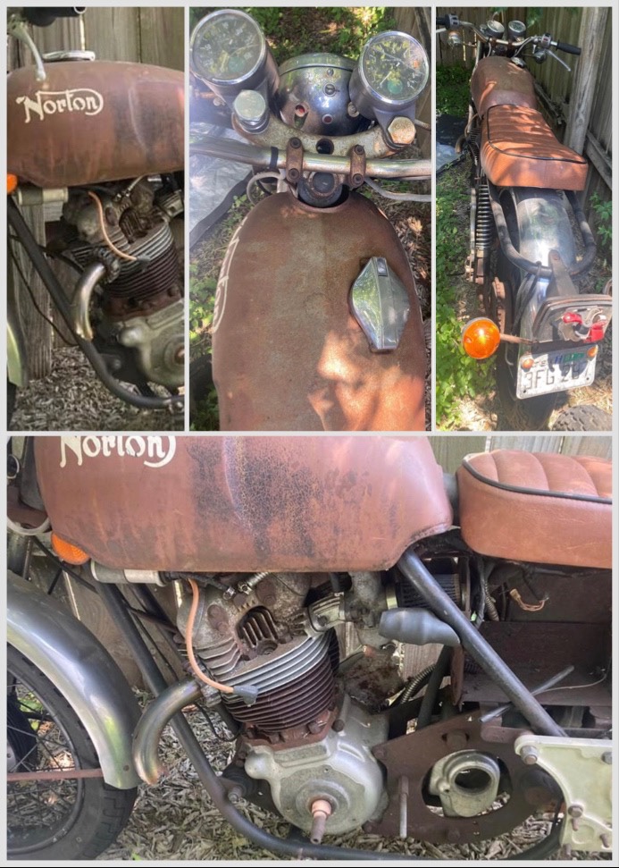 Piled behind some old Ford pistons and cam shafts. This Commando is in serious need of attention. Working on a plan to acquire it from my brother in law…