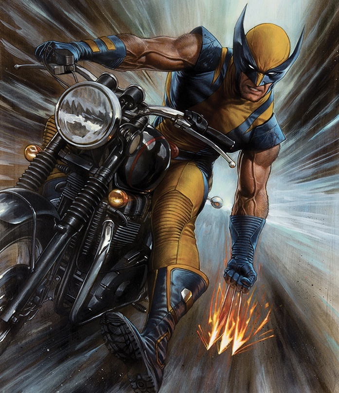 – X-Man Wolverine sharpens his retractable claws whilst speeding along the highway. The black Triumph Bonneville provides Weapon X with transportation. Illustration by Adi Granov.
