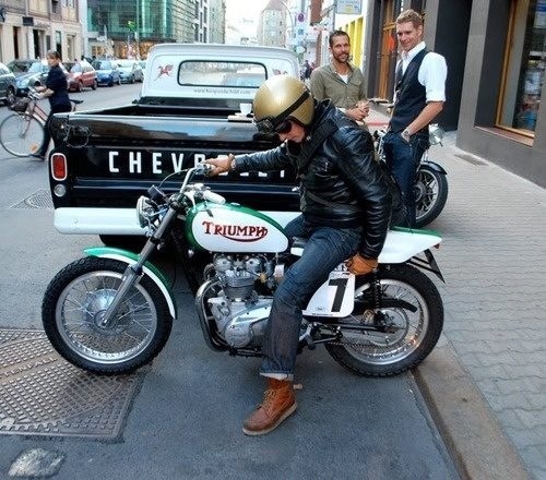 Finally, and appropriately for this blog, more of a photoshoot, he’s atop a vintage Triumph. I don’t know if its jeans, boots or even hair product, he’s promoting, but the bike sure looks splendid. Ready for a vintage track meet.