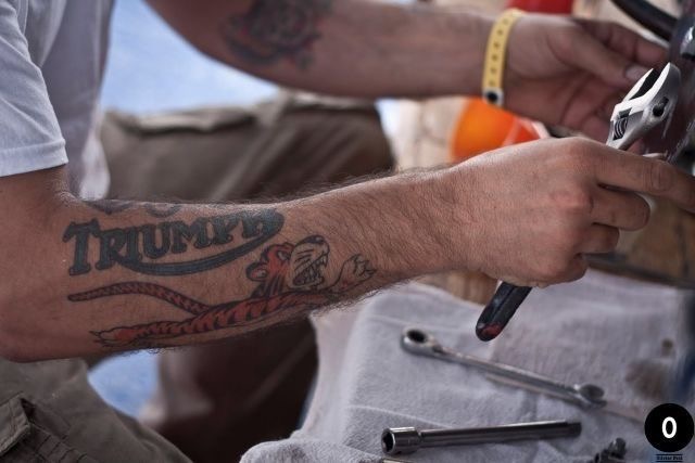 Reaching out for the ‘bar. A finely tattoo’d arm adorned with curly far eastern print graphics. Seems appropriate with the lines of a sweet looking ride. The Scrambler Triumph has a few special mods to enhance an off road appeal – well, rough lanes, not true dirt, but dusty paths nonetheless.