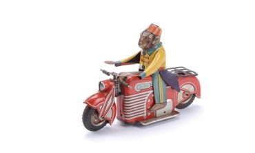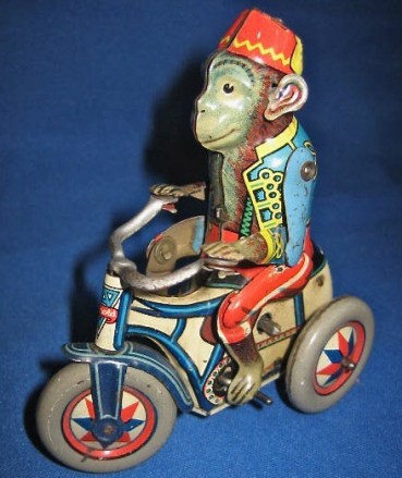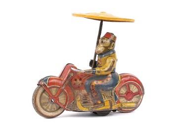Play was so much simpler in days past: you wound your toys up and watched ’em fly around the floor. No batteries, no motor; just nicely pressed metal parts and a character sitting astride.