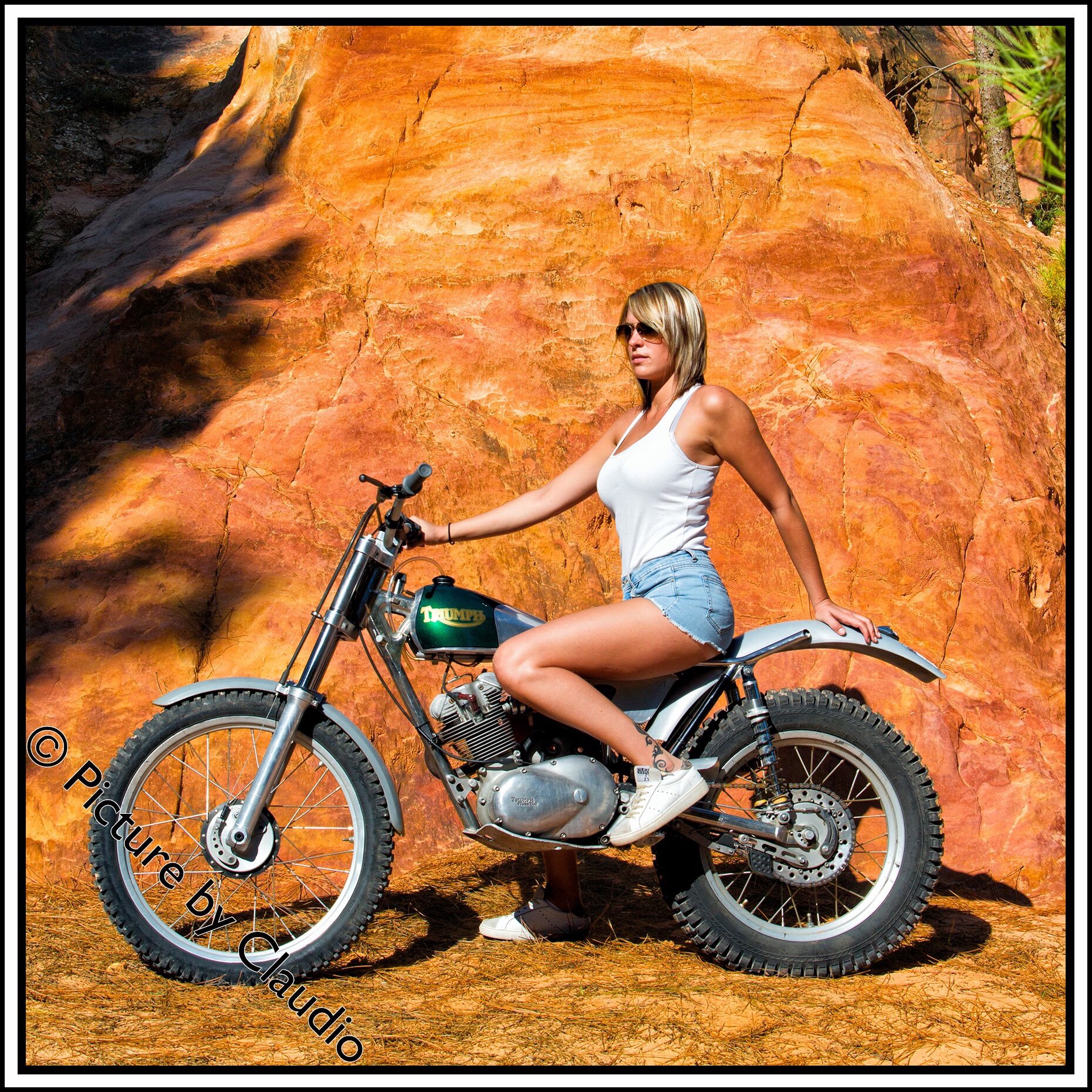 Hakuna Matata – ending the long work week with a nicely sorted Tiger Cub under bright skies with a sun kissed rock backdrop. Color scheme is the same as mine: dark emerald green tank and grey-silver fenders. The tigress might need something a little more sturdy than a tank top, daisy dukes and white tennies for any serious trail riding. But the aviators are cool.