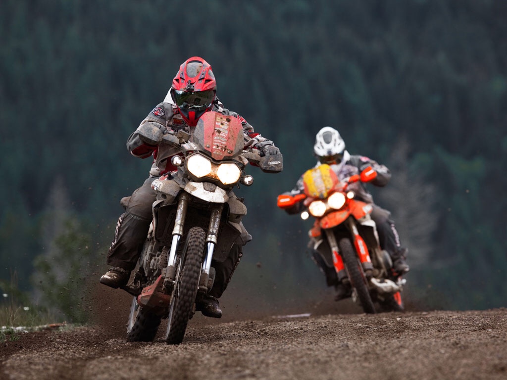 Pair of Tigers – sharp focus and narrow depth of field give these two a dynamic appearance as they rush towards the camera. The slight drift of the biting rear tire hurl the bike with gyroscopic forces across this field.