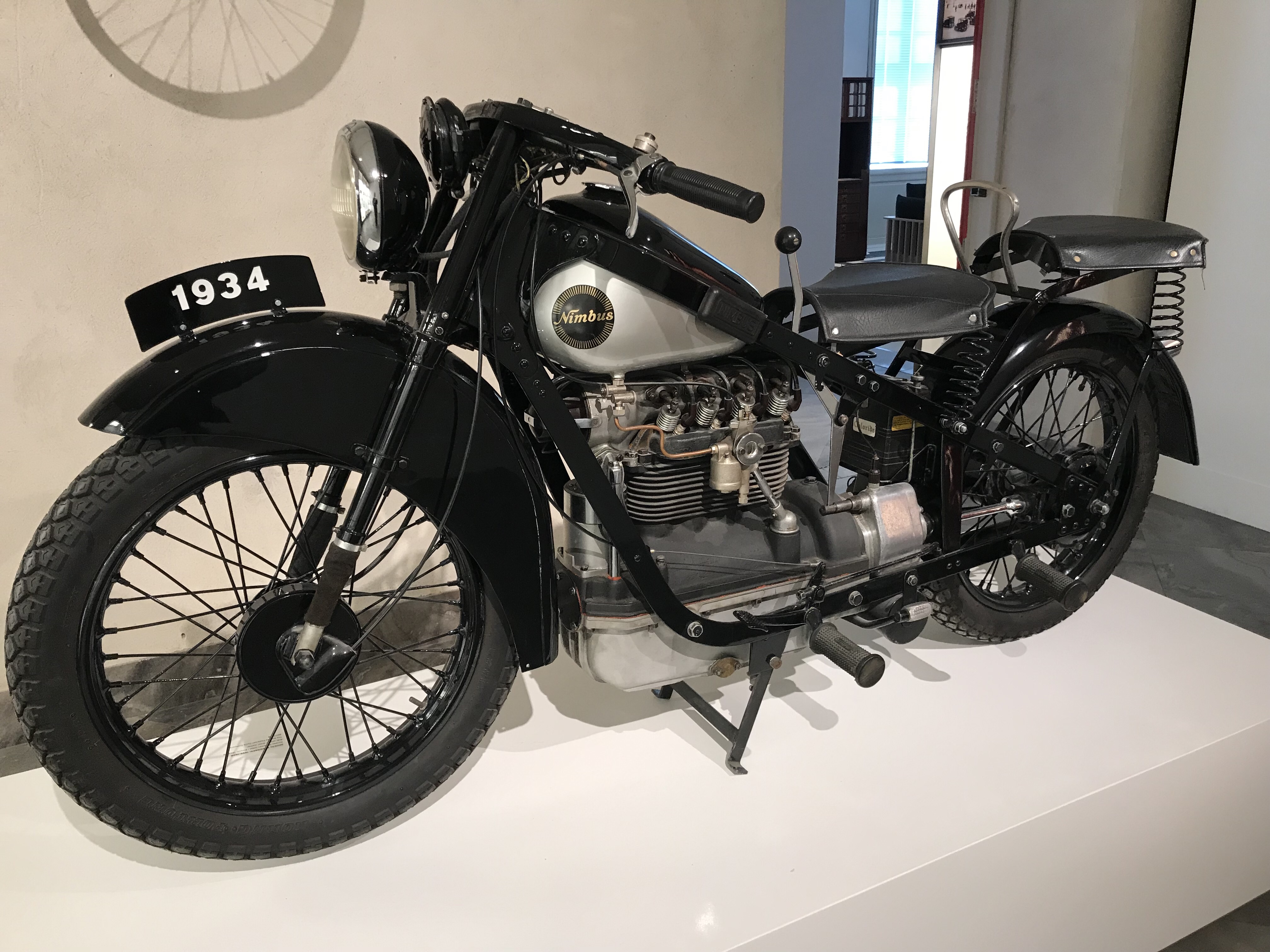 Bumblebee | My parents are enjoying a cruise around the Baltic this week. Their first port of call is the wonderful wonderful Danish city of Copenhagen. They sent this photo of the distinctive Nimbus motorcycle on display at a museum. The nimble and reliable in-line four 750cc engined workhorse became a staple mode of transportation for the Viking population. The Type C was introduced in 1934, when this model is from, and continued in very much this form until 1959. Its nickname was Humblebien (Bumblebee) due to a buzzing exhaust note.