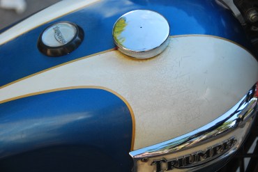 Crazing – I just loved the ceramic-like surface patina to this Triumph tank. The ivory swoosh emphasizes the peardrop shape; and the badge, filler cap and bolt cover add ornamentation.
