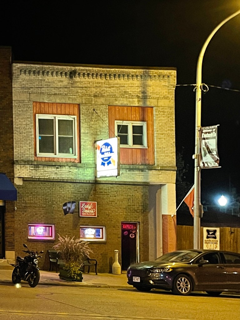 Local bar in Wisconsin with a Yamaha parked under the bright streetlight. The beef patty Lady Dawn burger was delicious.